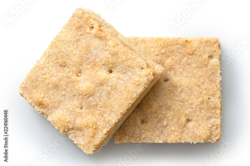 Two classic homemade square shortbread biscuits isolated on white from above.