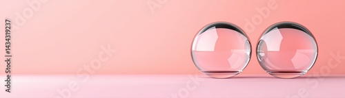 Two clear glass spheres sit on a soft pink surface, reflecting light in a minimalist setting.
