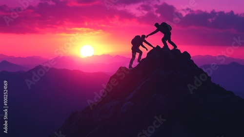 Two climbers assist each other at sunset atop a mountain, symbolizing teamwork and adventure.