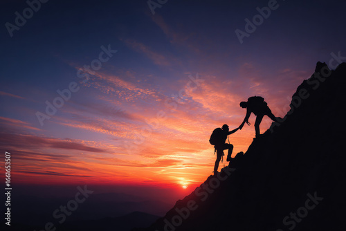 Two Climbers Reaching the Summit Against a Stunning Sunset Sky