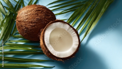 Two coconuts, one whole and one halved, rest on a light-blue surface, with palm fronds