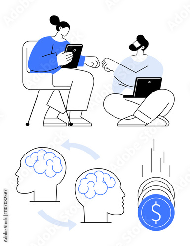 Two colleagues discussing with a tablet and laptop, connected brains, and coins depicting growth. Ideal for teamwork, collaboration, brainstorming, business, idea exchange, financial growth