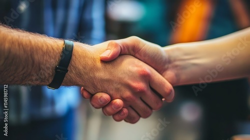 Two colleagues engaged in a handshake after an important meeting, symbolizing collaboration and agreement. The handshake between colleagues reflects trust and mutual understanding in business.