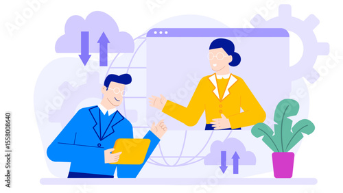 Two colleagues virtually meet discussing data transfer. Suitable for technology, communication, remote work concepts in business presentations and websites.