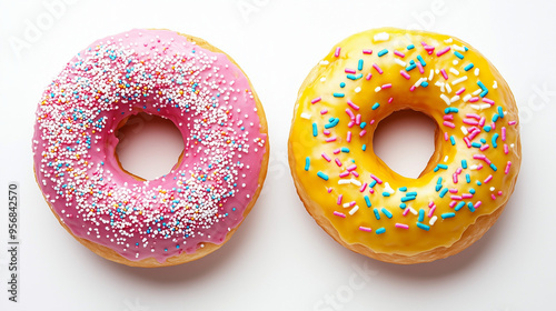 Two colorful bright sweet donuts in glaze with sprinkles. Delicious glazed donuts on a white background. Top view. generation AI
