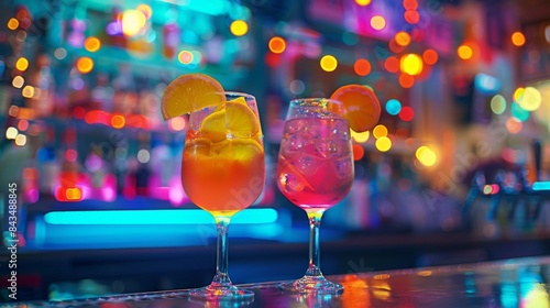 Two colorful cocktails with orange slices on a bar counter, illuminated by vibrant bokeh lights in a 3D rendering.