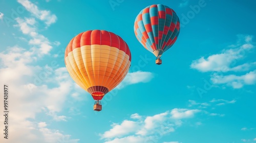 Two Colorful Hot Air Balloons Flying in Blue Sky with White Clouds