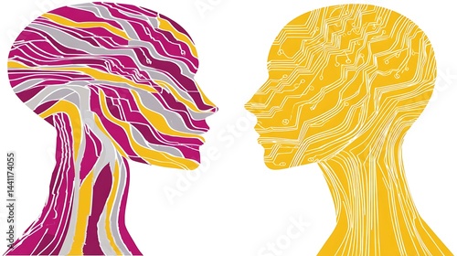 Two colorful human head silhouettes facing each other with intricate line patterns inside