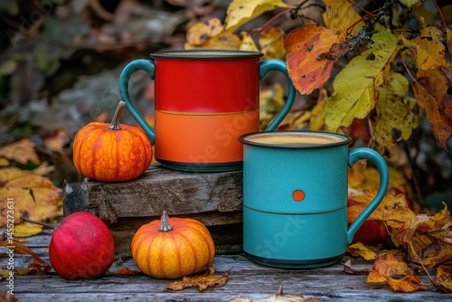 Two colorful mugs, orange and red, teal, sit on weathered wood amongst autumn leaves and pumpkins