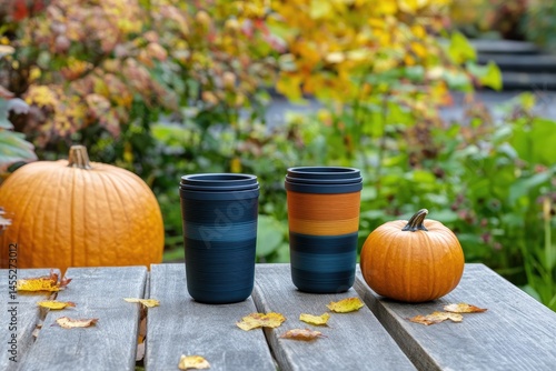 Two colorful reusable tumblers sit on a wooden table amongst autumn leaves and pumpkins. Blurred fall foliage creates a seasonal background