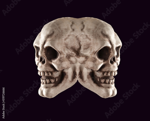 Two connected skulls. Human duality, Halloween concept. Opposite sides in person. Person ambivalent nature. High quality photo
