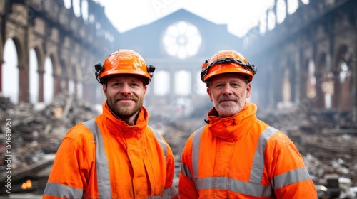 Two construction workers wearing orange safety gear stand inside a damaged building with debris and structural ruins in the background.