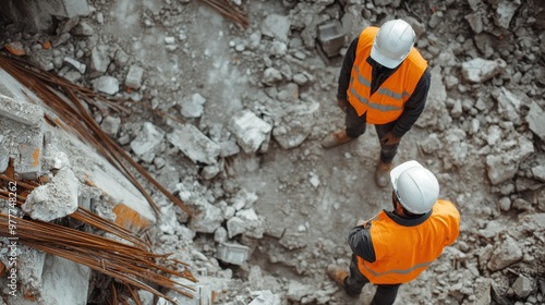 Two construction workers wearing orange safety vests and white helmets stand amidst the rubble of a construction site, engaged in discussion. Ensuring safety and progress.