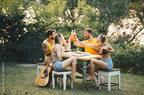 Two couples are sitting outside in nature, talking, enjoying and toasting with beer