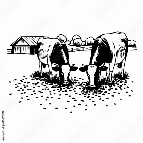 Two cows grazing on a farm in a peaceful rural setting, representing agriculture and livestock care.