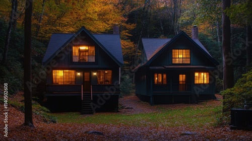 Two cozy cabins illuminated in a serene autumn forest setting.