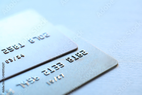 Two credit cards on light background, closeup