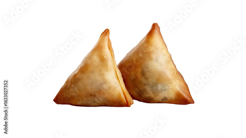 Two crispy fried Indian samosas with savory filling isolated on white background