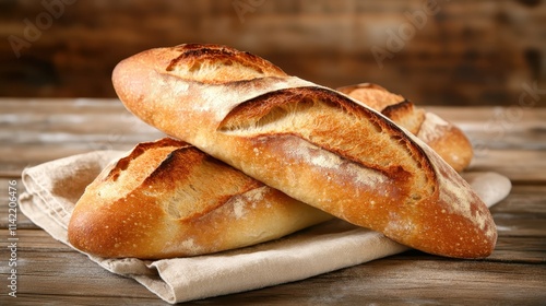 Two crusty, golden-brown baguettes are stacked on a cloth, presented against a rustic wooden background, representing delicious artisan bread in an inviting kitchen setting.