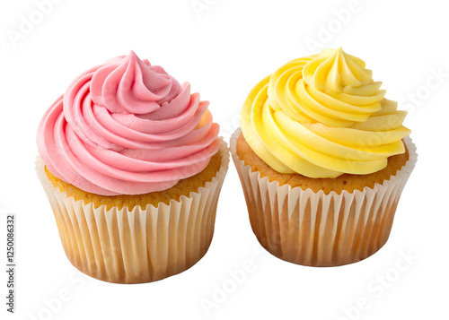 Two cupcakes with colorful icing on white table, bakery sweets, Cut Out