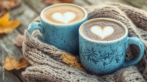 Two cups of hot chocolate with heart shape latte art on wooden table