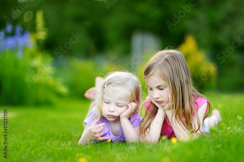 Two cute little sisters having fun on the grass