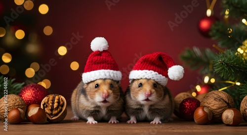 Two cute red squirrels posing on a red Christmas background wearing red Santa Claus hats. Conceptual digital painting illustration
