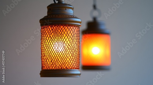 Two cylindrical hanging lamps emit a warm orange glow. Perfect for creating a cozy ambiance in a living room or dining area.