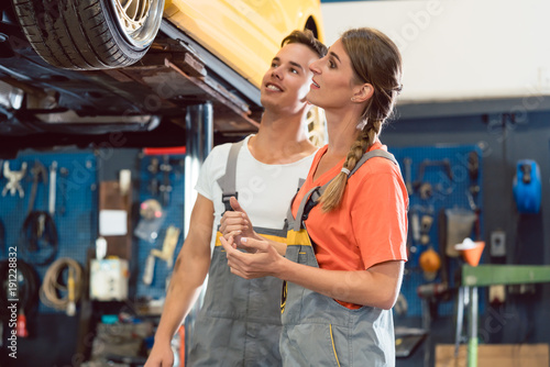 Two dedicated auto mechanics smiling happy, while checking the modified wheels of a tuned car after working together in a modern automobile repair shop with tuning service