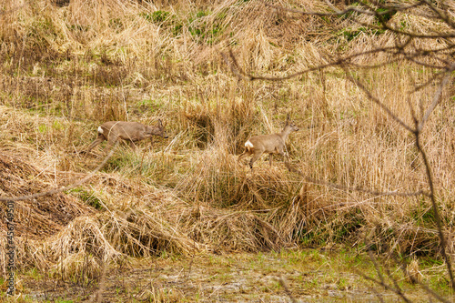 Two deer in tall grass.