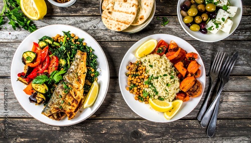 Two delicious and healthy meals featuring grilled fish and roasted vegetables on rustic wooden planks, alongside pita bread, olives, and feta cheese.