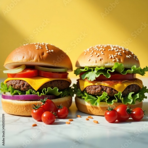 Two Delicious Big Juicy Burgers with Fresh Ingredients and Sesame Seed Buns
