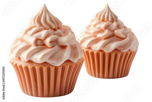 Two delicious looking pink frosted cupcakes in orange liners, sweet treat confectionery, isolated on transparent background