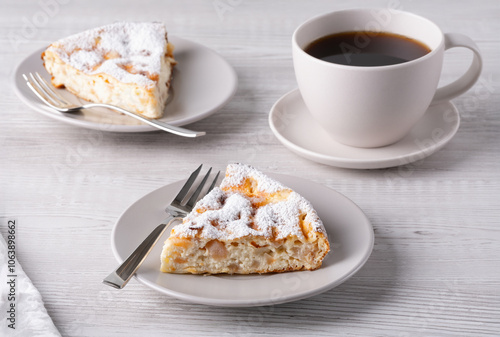 Two delicious pieces of cottage cheese casserole on a light wooden table.