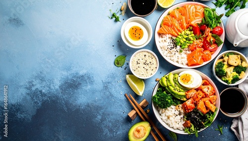 Two delicious poke bowls with fresh salmon, avocado, rice, and various toppings are beautifully arranged on a textured blue background with vibrant colors and style.