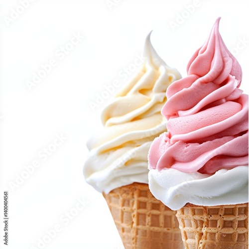 Two delicious soft serve ice cream cones in vanilla and strawberry flavors on a bright white background
