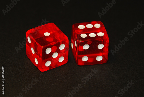 two dice on a black desk, result seven (7), one (1) and six (6)