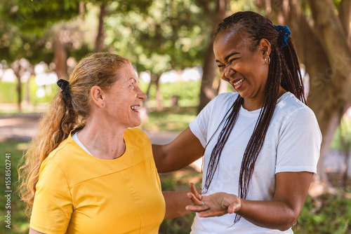 Two diverse senior women enjoying time together in a park, sharing stories and laughter, celebrating their friendship