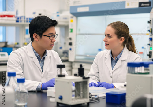 Two diverse university students, a young man and woman, collaborate and talk in a modern science laboratory.