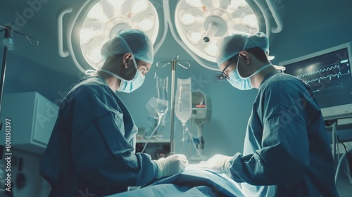 Two doctors with scrub caps medical gowns mask in operation room lights patient monitor in background