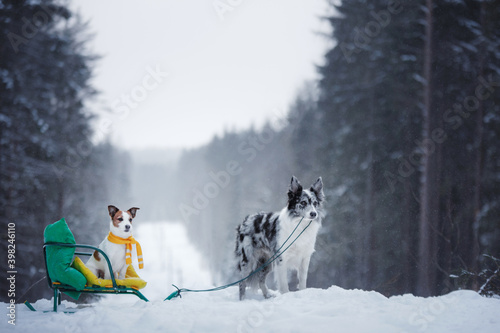 two dogs big and small in the winter. Jack Russell Terrier and Border Collie on a sled