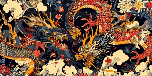 Two dragons fighting amidst flowers.