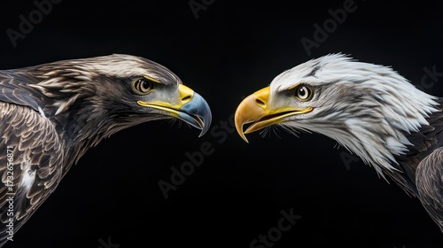 Two eagles face off against a stark black backdrop, showcasing their stunning detail