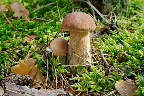Two edible boletuses with a cone among grass