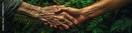 Two elderly hands, gnarled with time, clasped tightly together against the backdrop of a lush forest, with towering trees and vibrant green foliage.