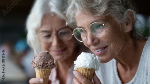 Two elderly women hold ice cream cones, one with chocolate and the other with vanilla. They share smiles and laughter in a sunny outdoor environment, reminiscing together