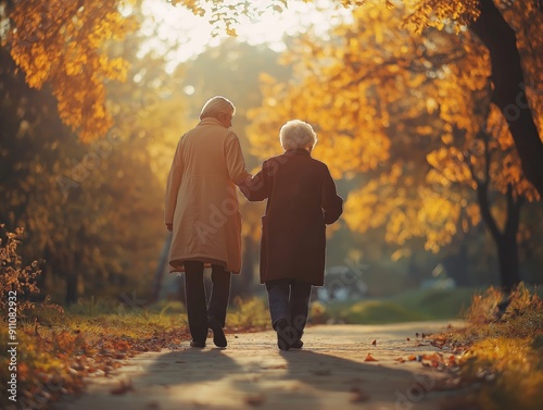 Two elderly women walking arm in arm on an autumn day.