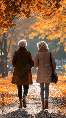 Two elderly women walking hand in hand through a vibrant autumn park.