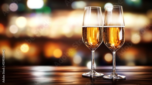 Two elegant champagne glasses on a wooden table, with a blurred festive background ambiance
