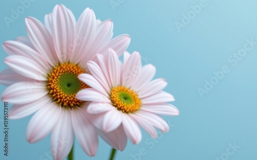 Two elegant daisies with soft pink petals and vibrant yellow centers against a pastel blue background